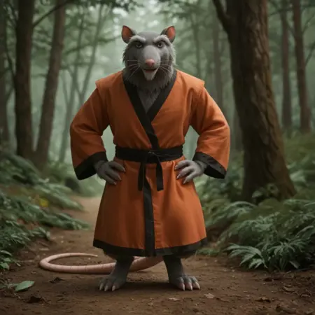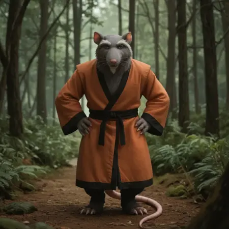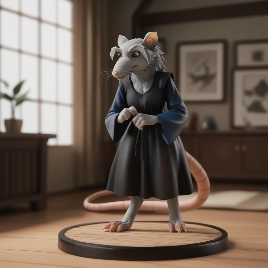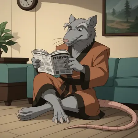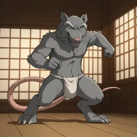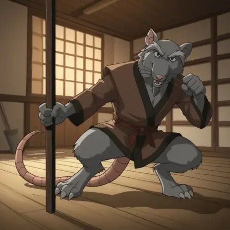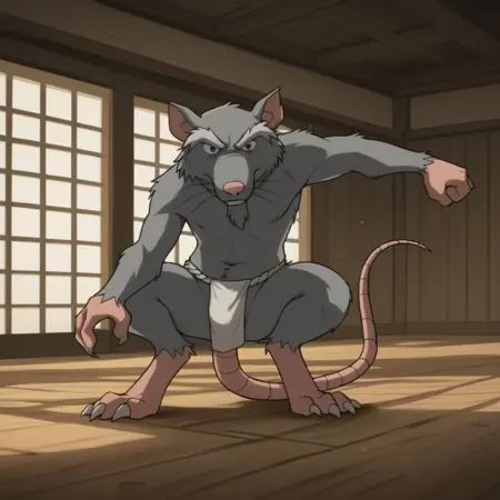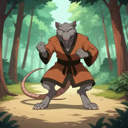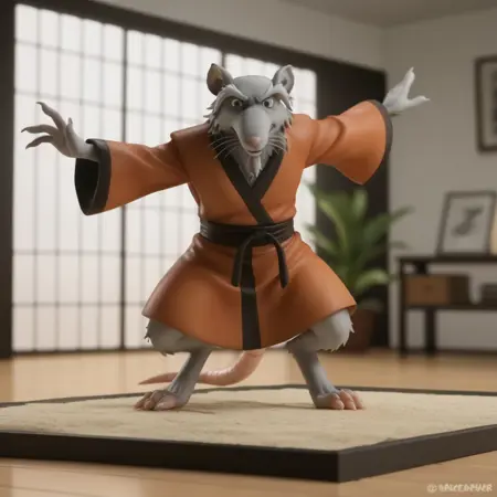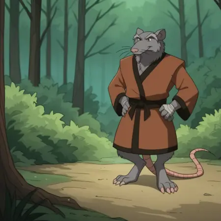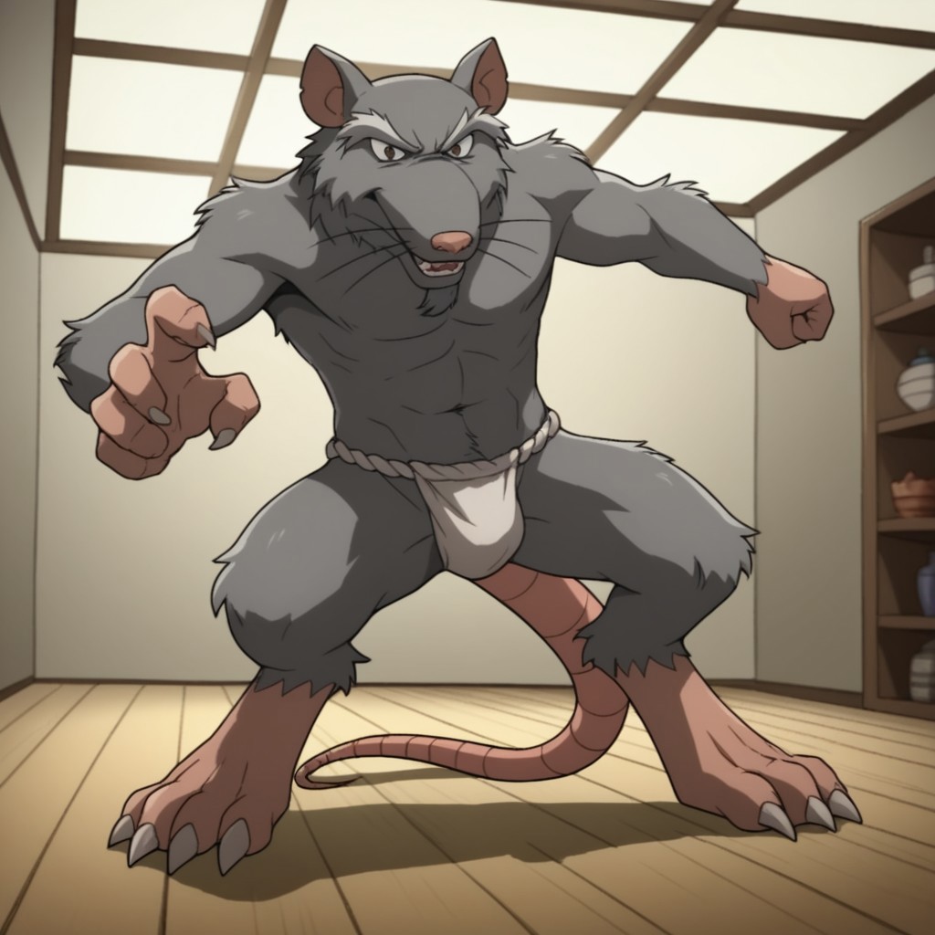 Splinter03v2, semi-anthro, male, rat, grey fur, brown eyes, rat tail, red-orange kimono