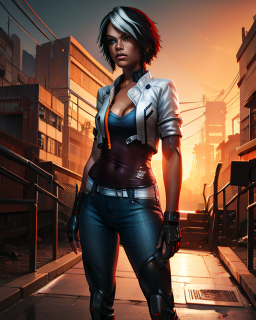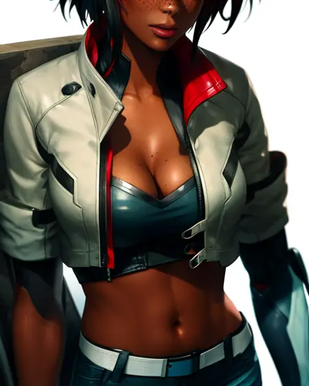 cropped jacket,short sleeves,red shirt,fingerless glove,single elbow sleeve, belt, jeans,