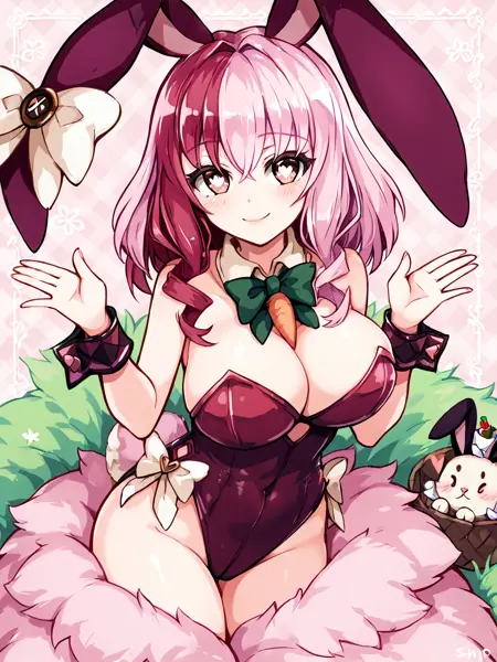 marchharemge, monster girl encyclopedia, 兔耳朵, 五彩头发, 领结, 双色头发, 符号形瞳孔, 心形瞳孔, 怪物娘, 兔尾巴, 兔娘, 紧身衣, 手腕护套, 《花花公子》兔女郎, 露肩, 毛皮, 过膝毛皮, 粉色毛皮
