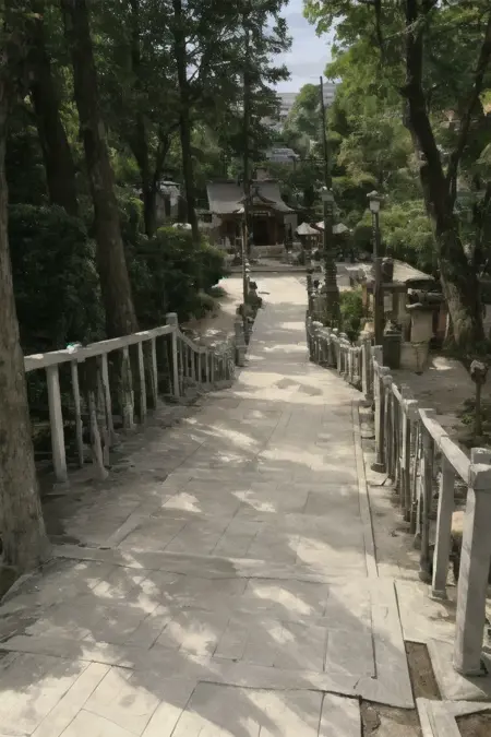 jinzya, tree, scenery, stone lantern, outdoors, real world location, torii, stairs, shrine, day, traditional media, road, pavement, statue,
