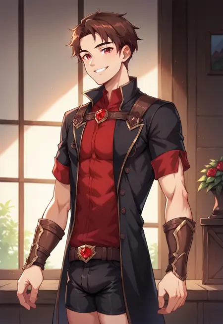 red tunic, short sleeves, black shorts, long black coat, brown belts, brown fingerless gauntlets, bracers, red gemstone, brown boots,