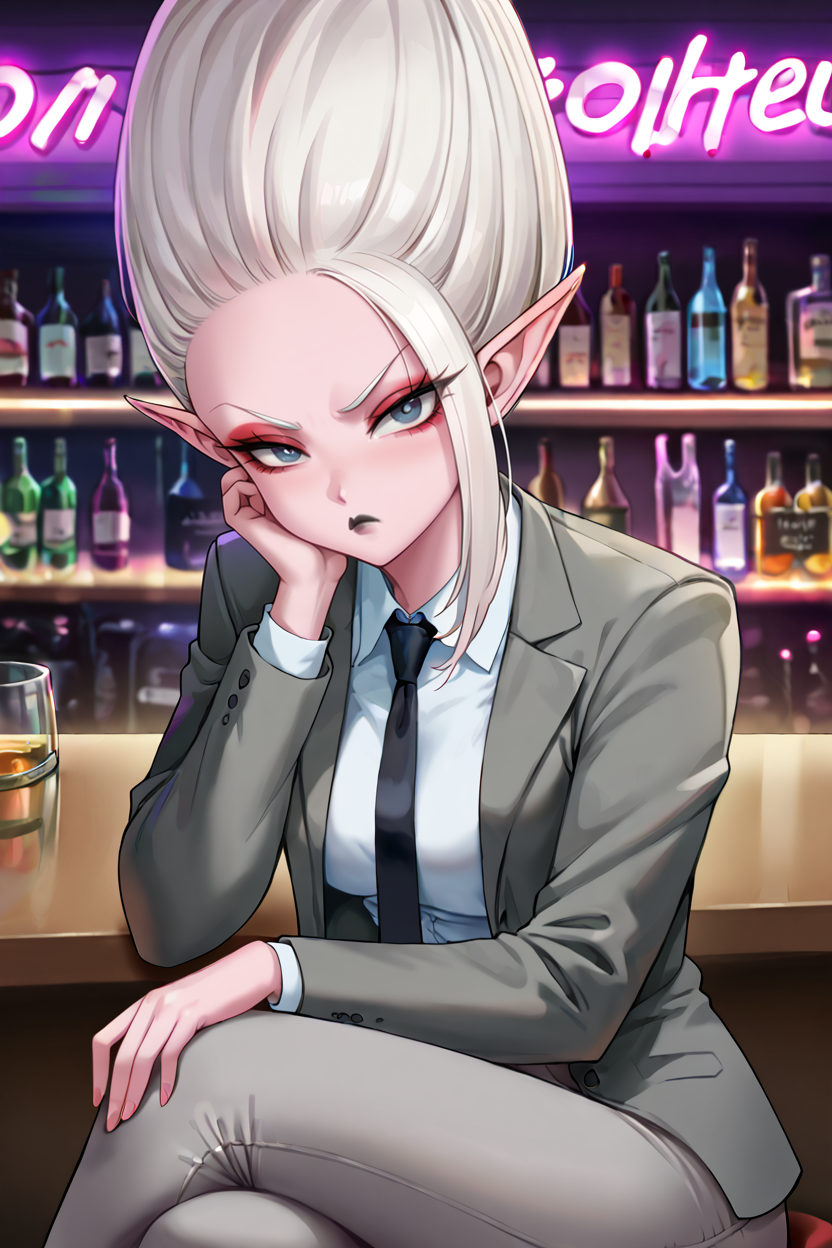 arinsu, 1girl, pink skin, pointy ears, white hair, hair slicked up, blue-grey eyes, red eyeliner, black lips, asymmetrical bangs, black nails, long hair