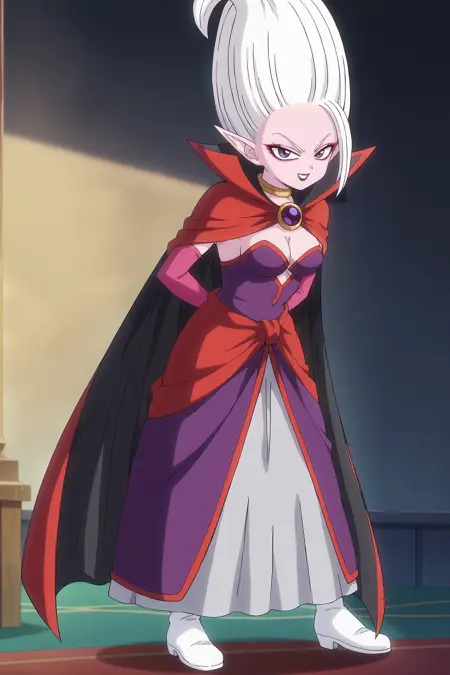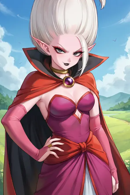 purple layered dress, strapless dress, front slit, two-sided cape, red cape, black cape, pink bridal gauntlets, red sash, purple brooch, gold neck ring, grey long skirt, elbow gloves, white boots, high heels