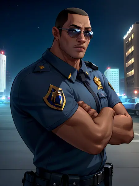 Prompts: Jefferson_M, bara, facial hair, police outfit, dark skinned male