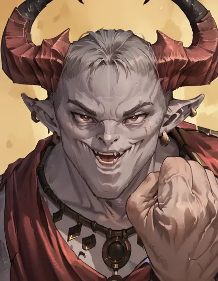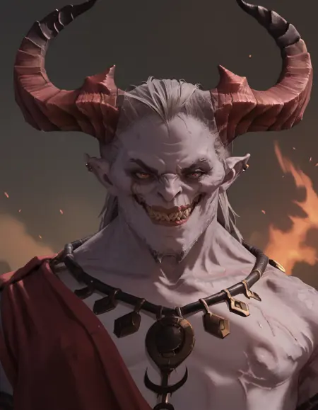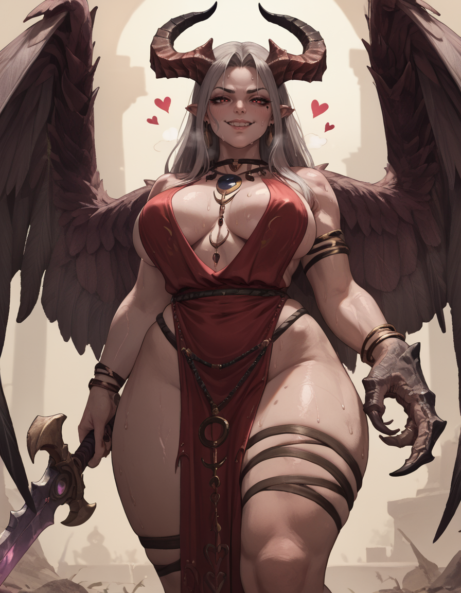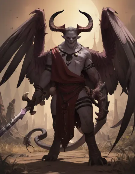Azazel, wings, horns, claw, holding sword, tail,