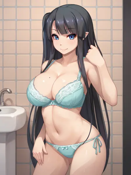 myusca, succubus prison, myusca from succubus prison, succubus, very long hair, blue eyes, black hair, pointy ears, mole, large breasts