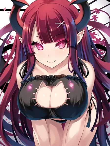myusca, succubus prison, myusca from succubus prison, succubus, demon girl, very long hair, pink hair, red hair, wings, horns, pink eyes, pointy ears, mole, large breasts, glowing eyes, black sclera, slit pupils