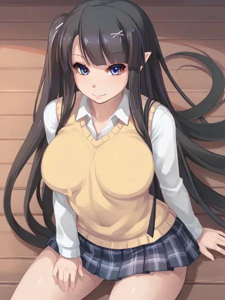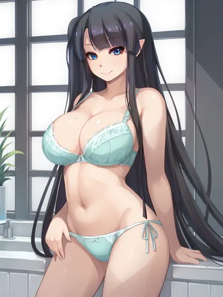myusca, succubus prison, myusca from succubus prison, succubus, very long hair, blue eyes, black hair, pointy ears, mole, large breasts