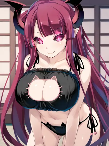 myusca, succubus prison, myusca from succubus prison, succubus, demon girl, very long hair, pink hair, red hair, wings, horns, pink eyes, pointy ears, mole, large breasts, glowing eyes, black sclera, slit pupils