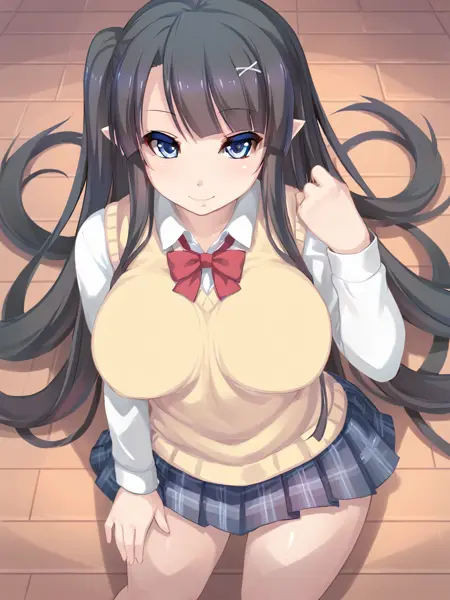 hair ornament, skirt, school uniform, shirt, one side up, plaid skirt, sweater vest, red tie