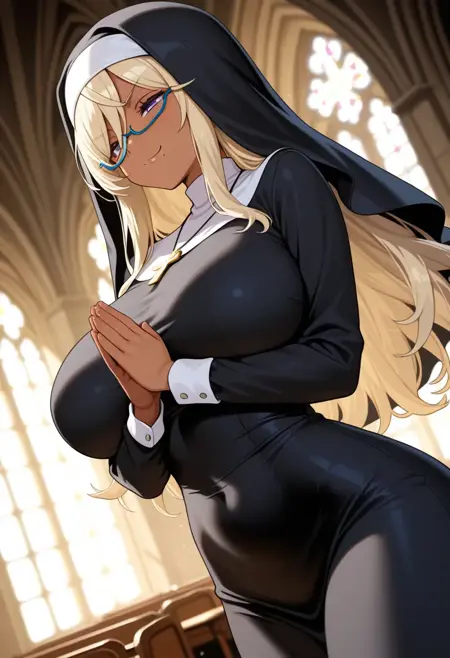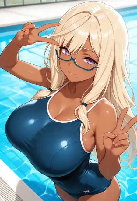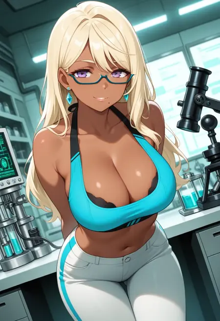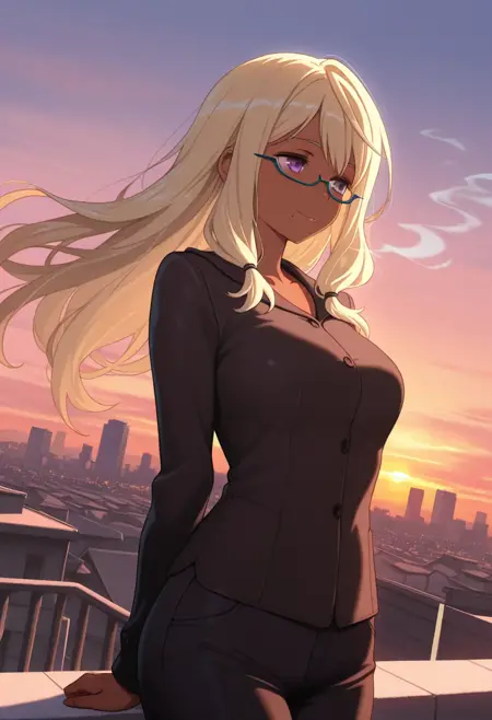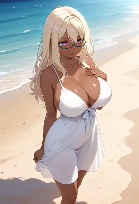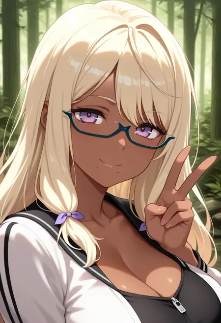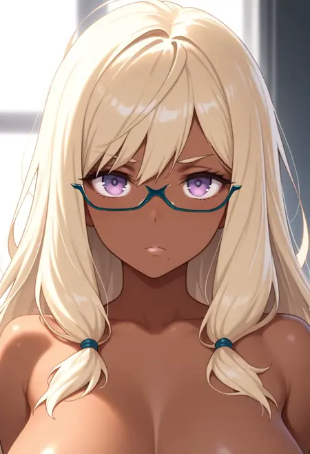 D5,长发,紫色眼睛,眼镜,深色皮肤,深色皮肤女性,金发,下框眼镜,痣,嘴下有痣,
