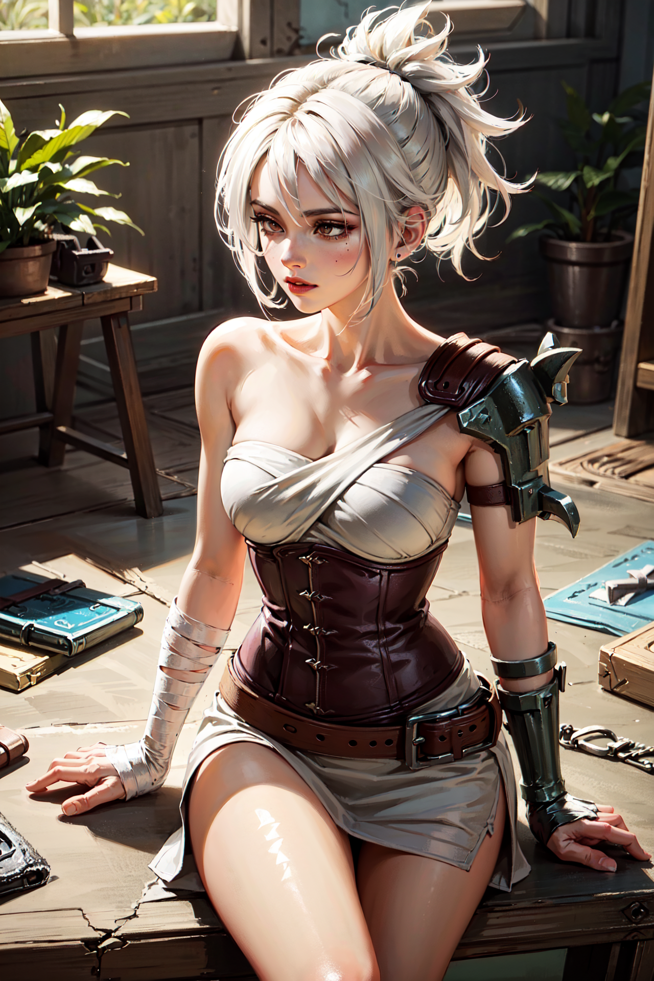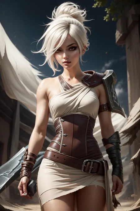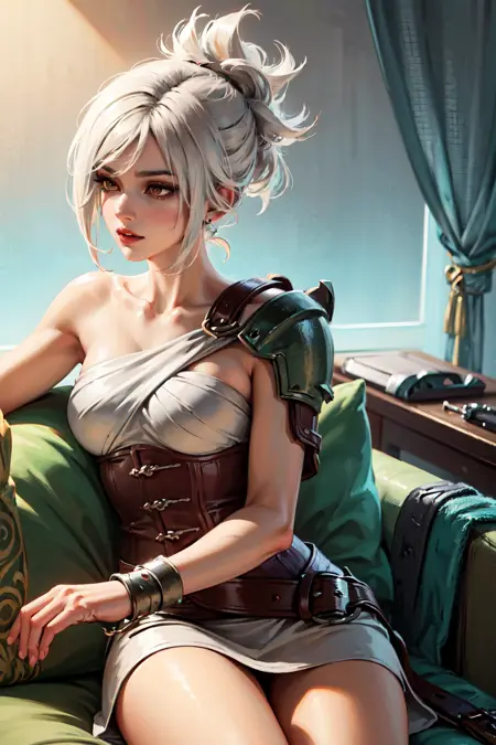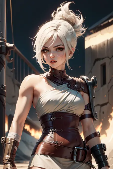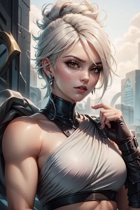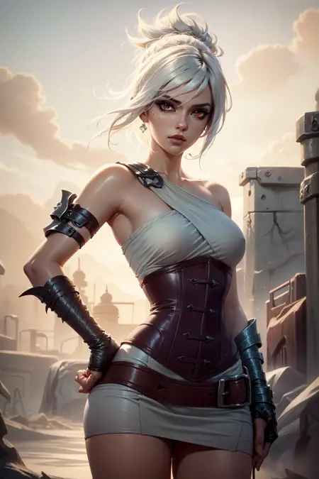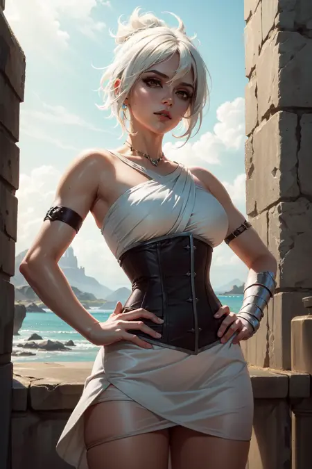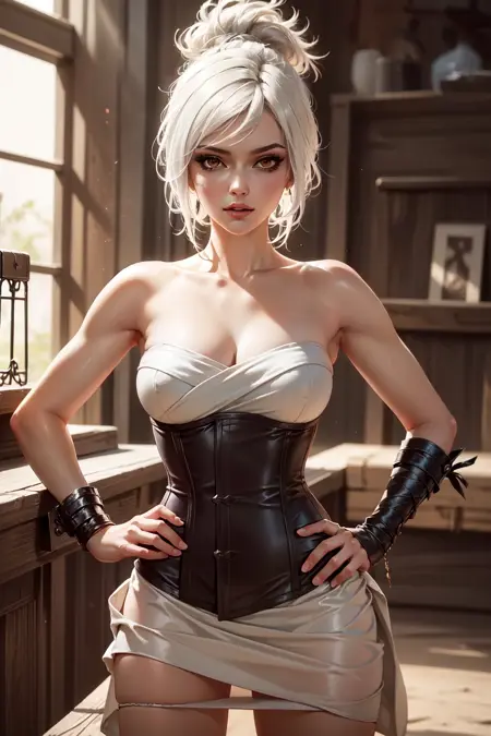 optional tags: folded ponytail, short dress, corset, single pauldron, white hair, black eyeshadow, bare shoulders, facial mark