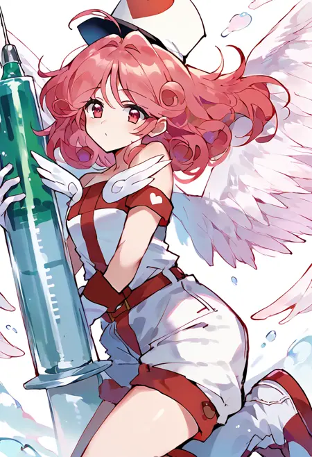 lily_ygo,1girl,wings,hat,nurse cap,gloves,heart,nurse,boots,shorts,angel wings,(syringe, oversized object, holding syringe:1.1),