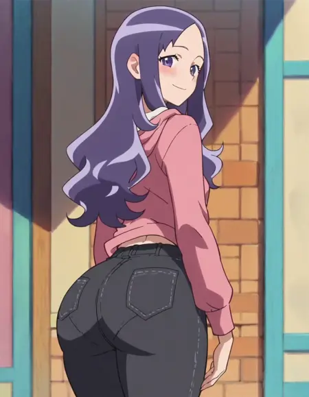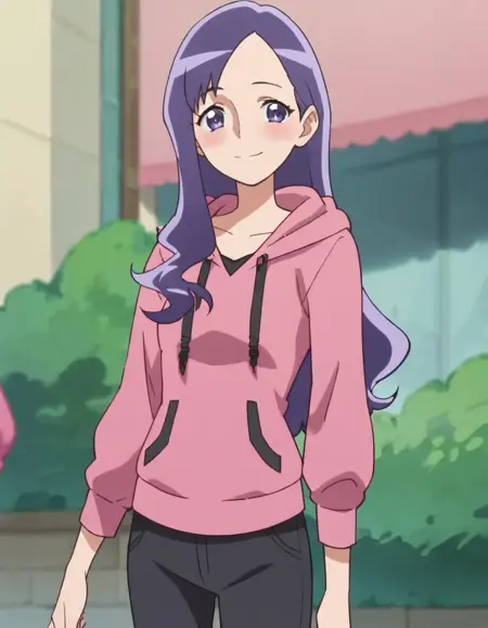 score_9, score_8_up, score_7_up, anime screencap, solo,1girl, long hair, pants, purple hair,pink hood, purple eyes, hoodie, looking at viewer, long sleeves,lora:kurumimomoka:0.8