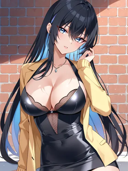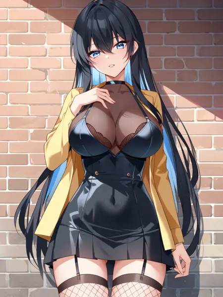 softrice, weinan, bangs, blue eyes, grey eyes, long hair, black hair, multicolored hair, mole, hair between eyes