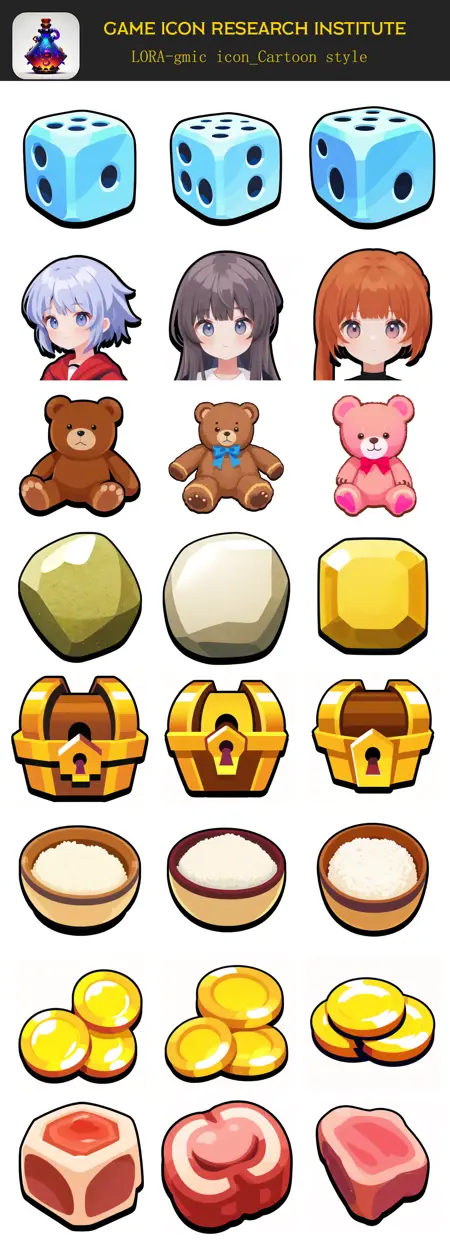 示例:<lora:gmic icon_2d cartoon icon:0.85>,gmic icon \(2dkat\),white background,The brass trophy,with a white background and black borders,masterpiece,best quality,great quality,good quality,game item icon,