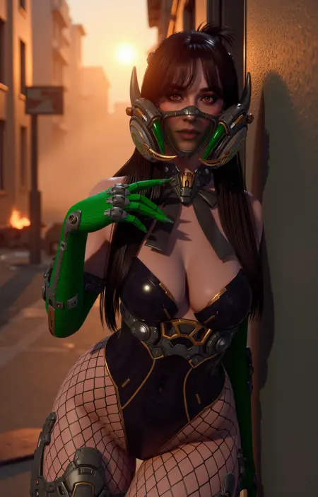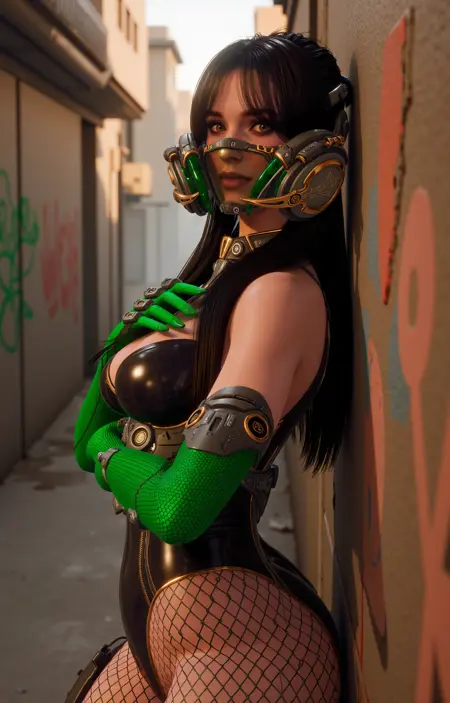 발에는 금속 장식이 있는 미래적 허벅지까지 오는 부츠를 신고 있다. 캐릭터는 입을 가리는 미래적 투명한 마스크를 착용하고 있다.