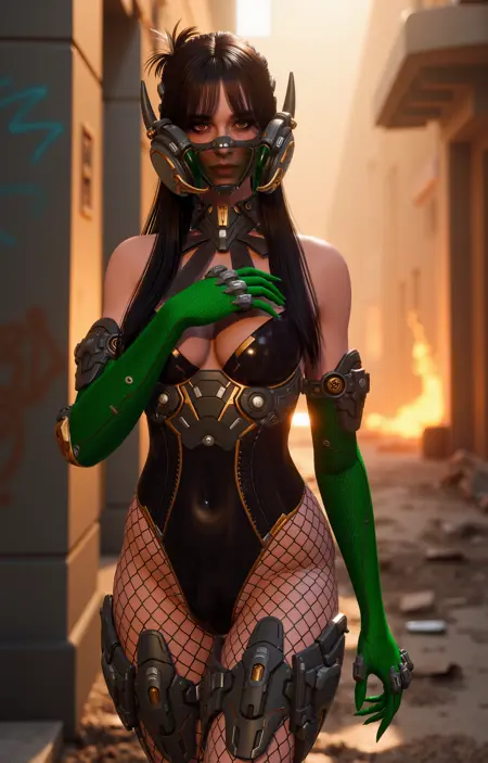 TFD-Freyna-ULT. 그녀는 긴 검은 머리카락을 가지고 있으며, 풍만한 가슴을 강조하는 핏이 뛰어난 바디수트를 입고 있다. 그녀의 바디수트는 주로 검은색이며, 갑옷처럼 복잡한 기계적인 디자인을 가지고 있다. 또한 그녀는 팔꿈치 길이의 녹색 장갑을 착용하고 있다. 다리는 허벅지까지 이어지는 패션 네트 스토킹으로 덮여 있으며, 그 아래 피부가 드러난다.
