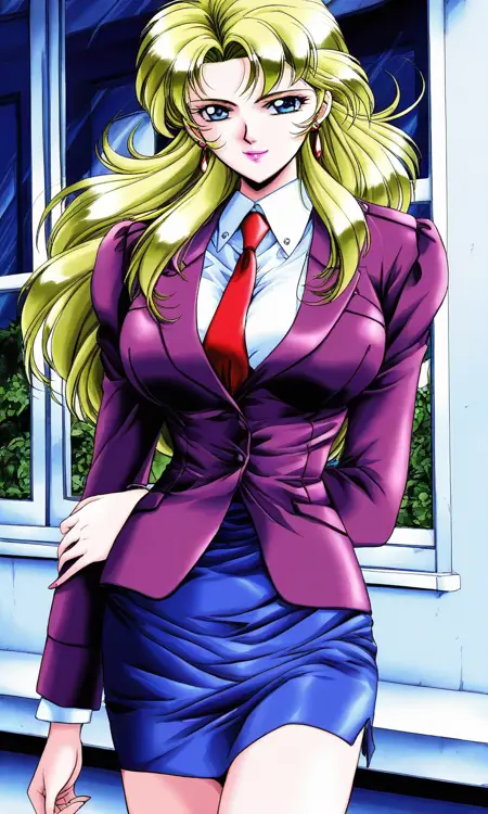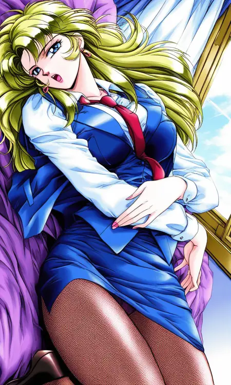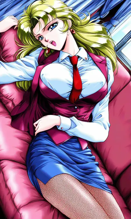 Naitou_Midori, 1girl, solo, blonde green hair, blue eyes, jewelry, earrings, long hair, large breasts, pink lipstick,