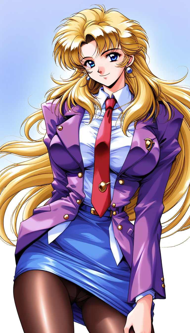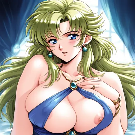 Naitou_Midori, 1girl, solo, blonde green hair, blue eyes, jewelry, earrings, long hair, large breasts, pink lipstick.,