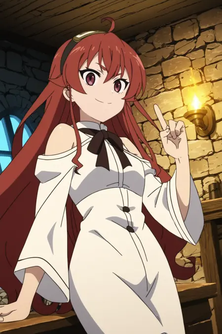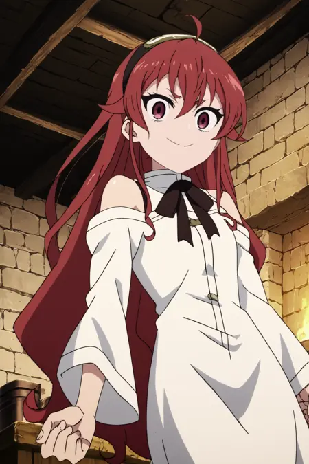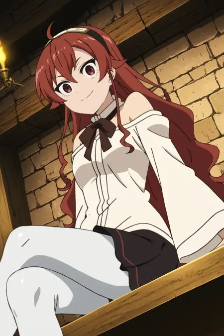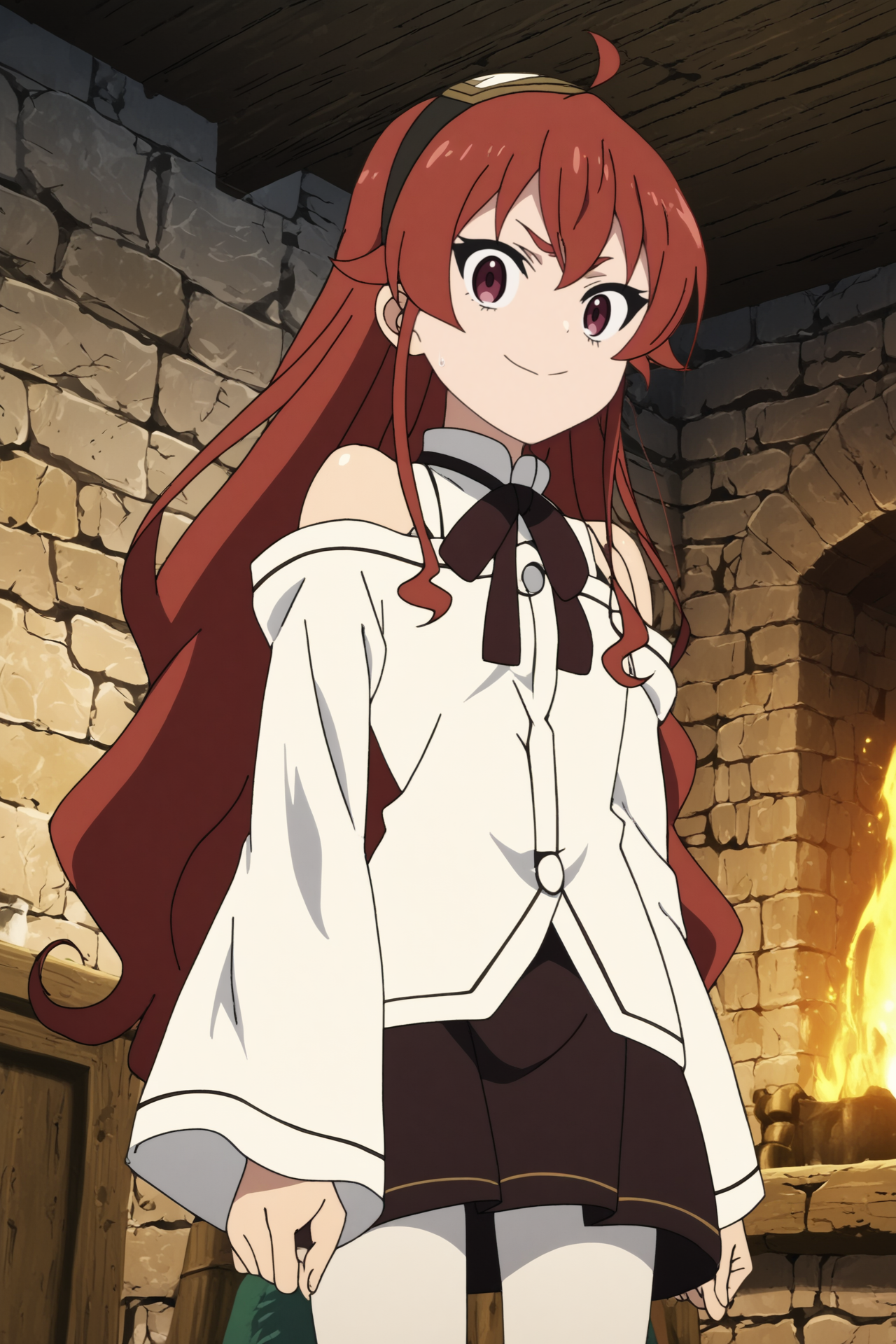 트리거: eris boreas greyrat, 1girl, solo, looking_at_viewer, 빨간 눈, 긴 머리, ahoge, 앞머리, 검은 헤어밴드, 헤어밴드, 눈 사이의 머리카락, 미소, 긴 소매, 목 립본, 팬티스타킹, 립본, 셔츠, 어깨 절개, 치마, 흰 팬티스타킹, 흰 셔츠, 넓은 소매