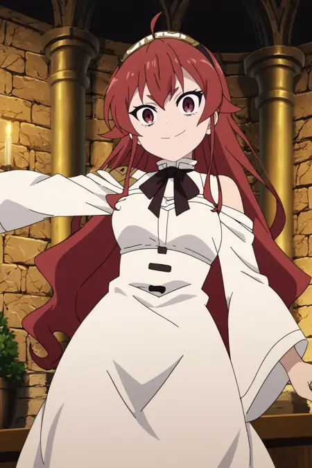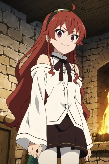 触发词:eris boreas greyrat,1girl,solo,looking_at_viewer,red eyes,long hair,ahoge,bangs,black hairband,hairband,hair between eyes,smile,long sleeves,neck ribbon, pantyhose, ribbon, shirt, shoulder cutout, skirt, white pantyhose, white shirt, wide sleeves