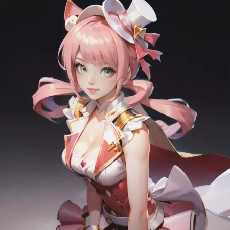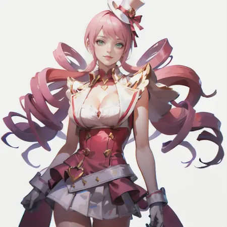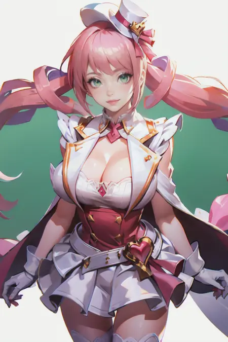 프롬프트: Annette_Melody, 1girl, solo, hat, mini hat, top hat, white headwear, long hair, very long hair, twintails, drill hair, twin drills, braid, bangs, pink hair, looking at viewer, green eyes, lips, parted lips, smile, closed mouth, ribbon, cleavage, breasts, large breasts, gloves, white gloves, belt, skirt, pleated skirt, miniskirt, white skirt, legs, thighhighs, white thighhighs, boots, high heels, pink footwear, cape, idol