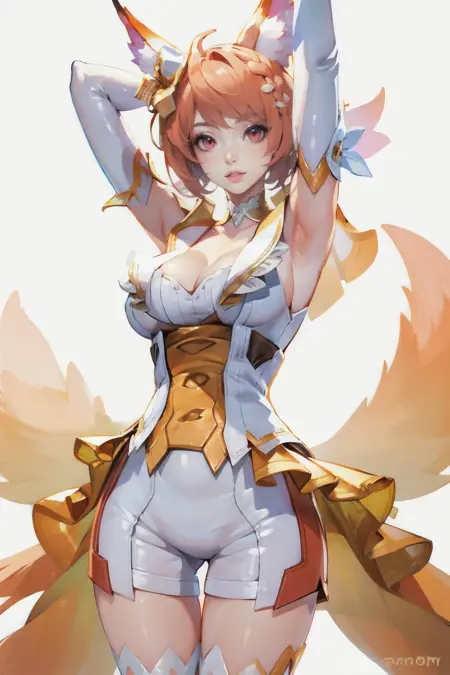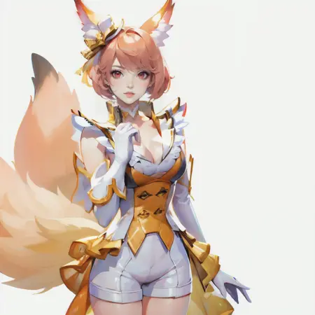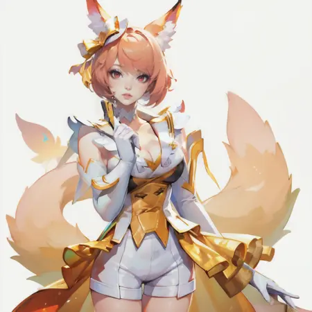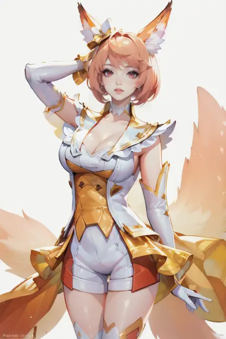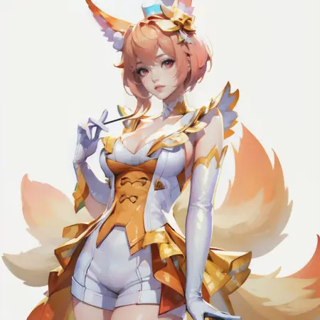 프롬프트:, Liliana_Melody, 1girl, solo, hat, mini hat, top hat, bow, animal ears, fox ears, short hair, hair ornament, bangs, blonde hair, orange hair, looking at viewer, red eyes, make up, lips, pink lips, parted lips, smile, choker, cleavage, breasts, large breasts, alternate costume, gloves, elbow gloves, white gloves, shorts, short shorts, white shorts, thighhighs, white thighhighs, high heels, fox tail, multiple tails, magical girl