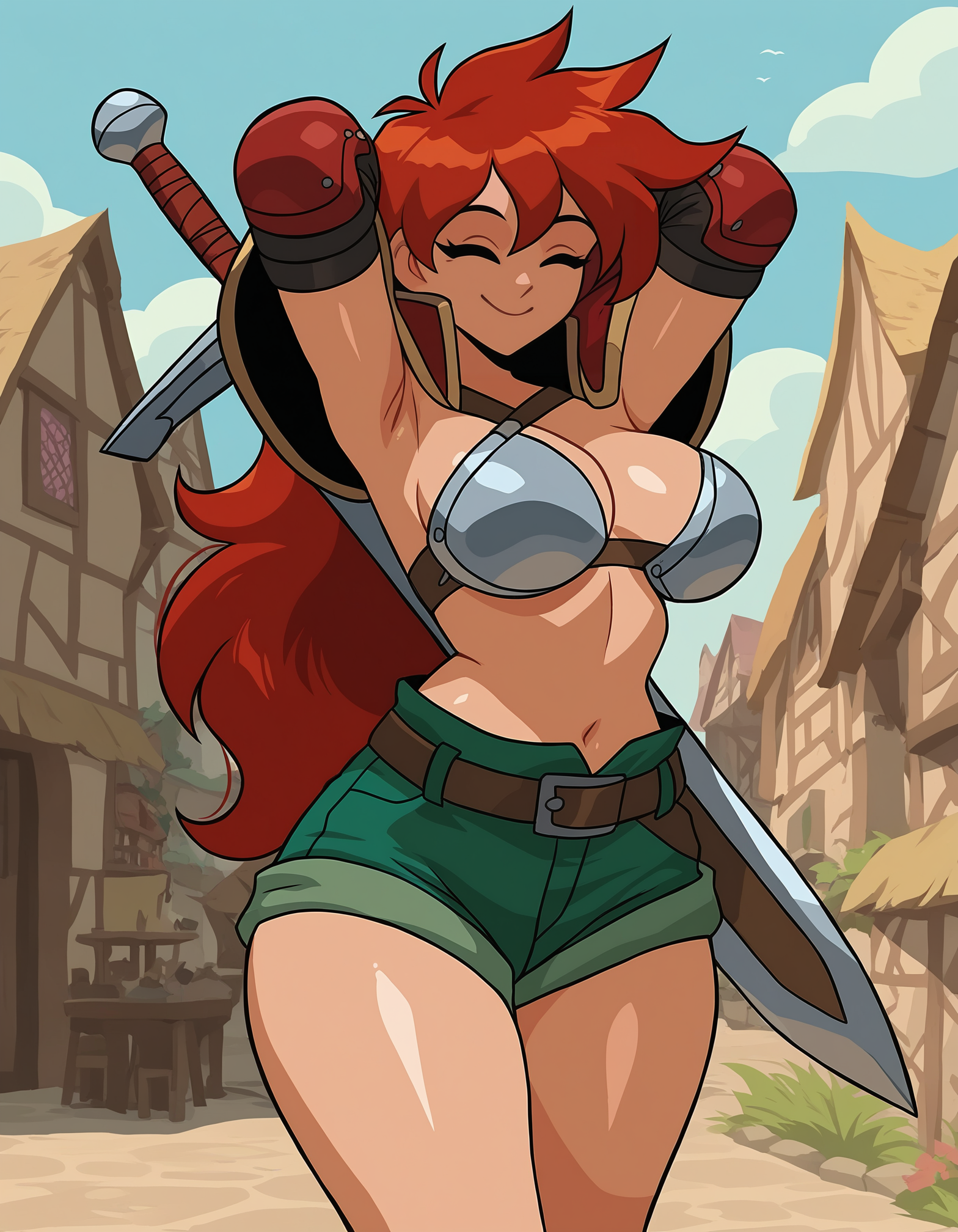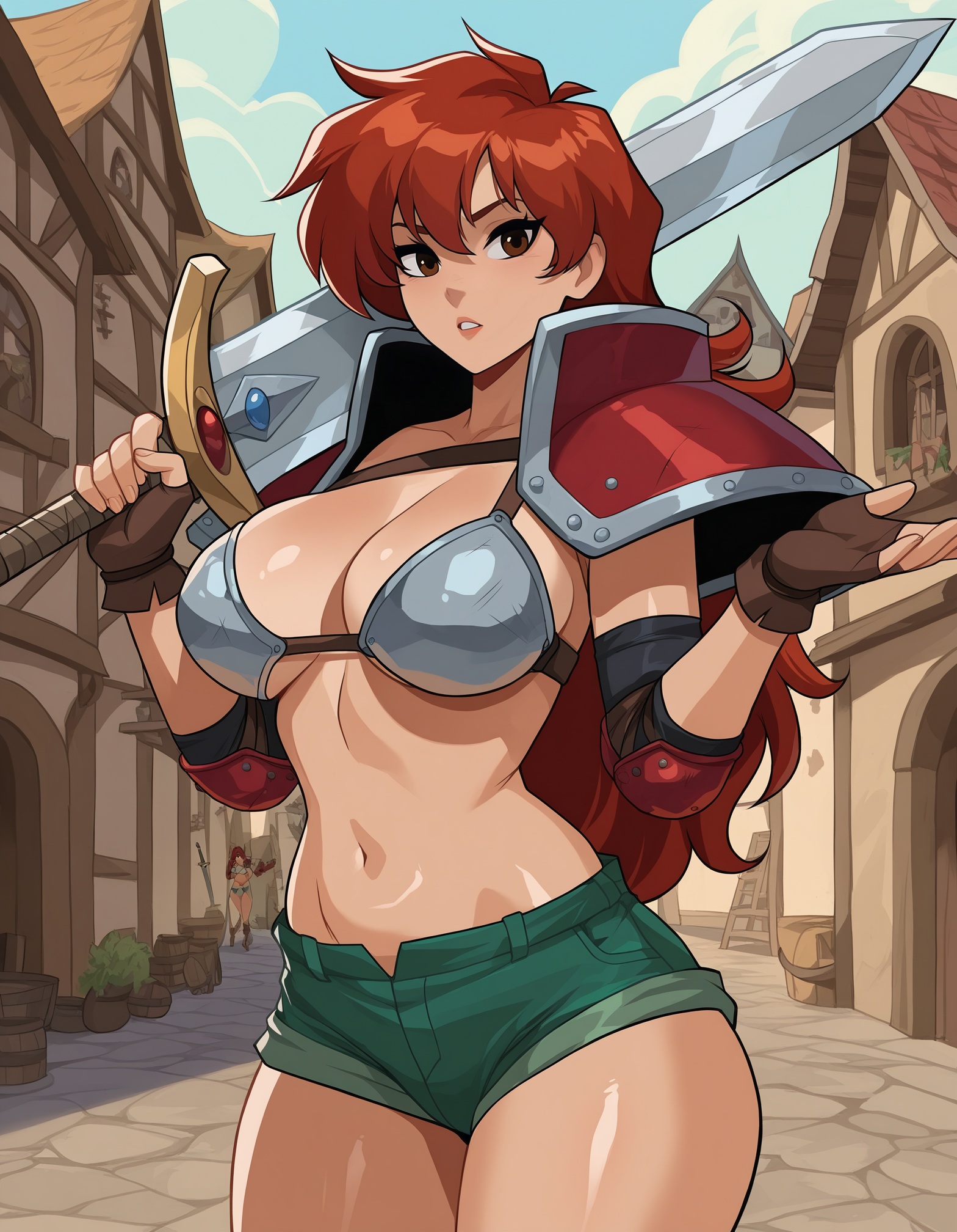 bikini armor, red pauldrons, elbow pads, fingerless gloves, green shorts, midriff, boots, knee pads,