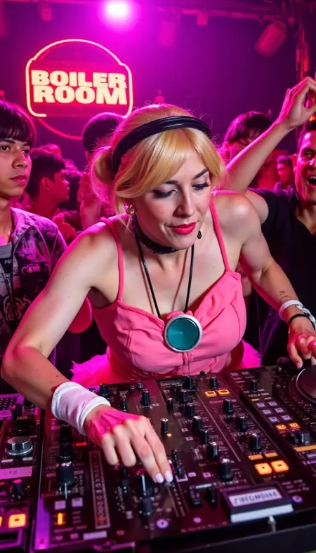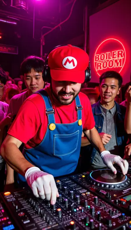 "b0173r_r00m, man wearing super mario cosplay playing a dj set at a boiler room nightclub. he is surrounded by a group of people"