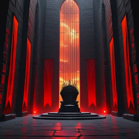 cpolldreamyfortress, cpolldftoerom, 王座の間、異世界、王座、屋内、オレンジ色の空、空に輝くオレンジ色の雷、鮮やかな紫色の霧