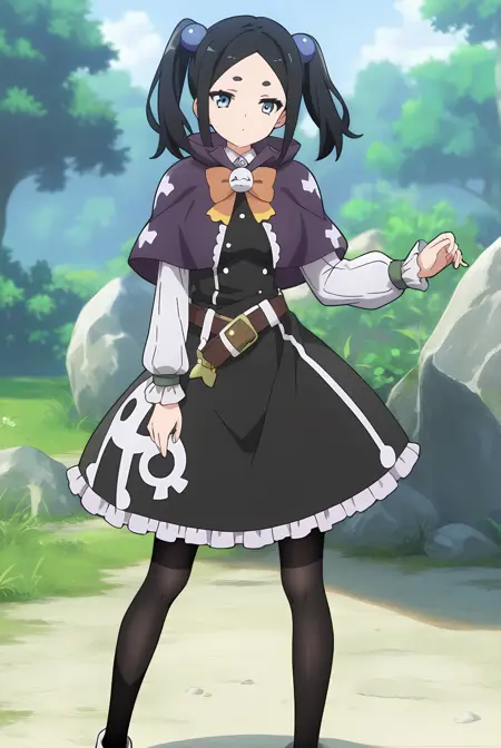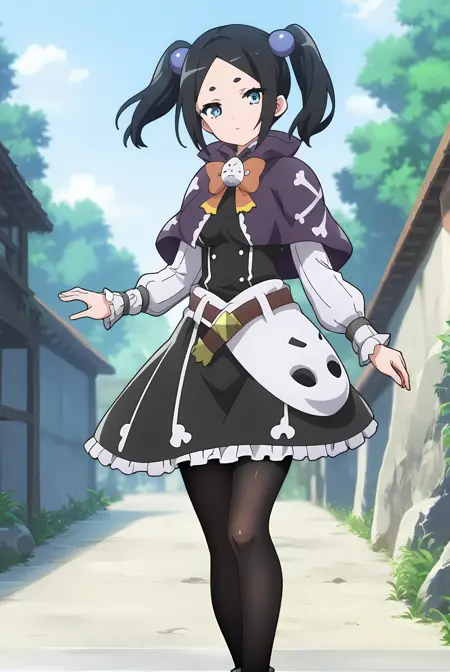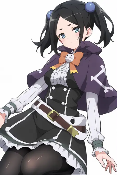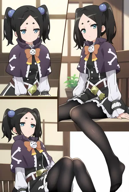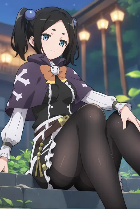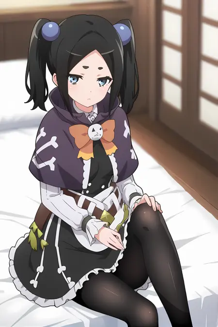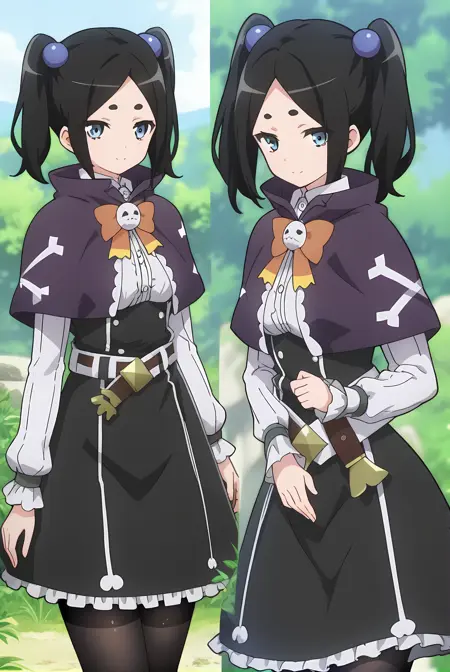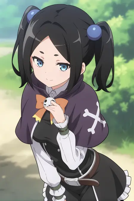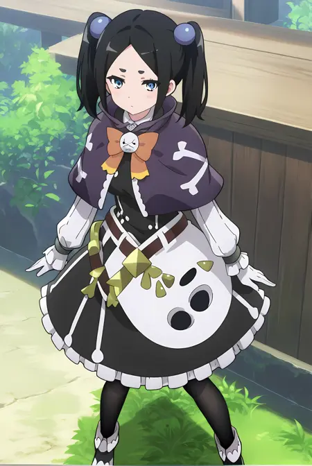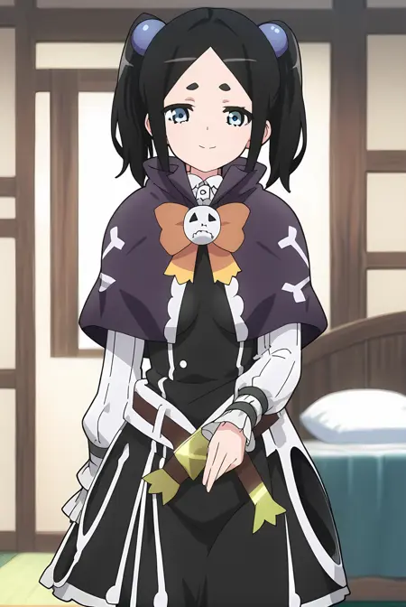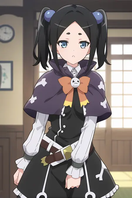 ブラックの髪、ショートのツインテール、ブルーの目、ブルーのヘアボブ