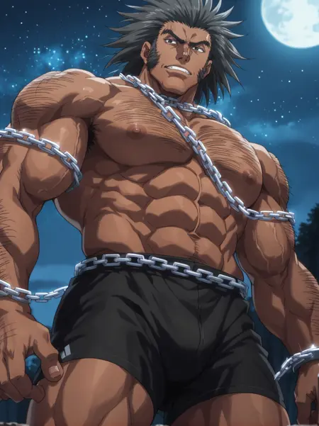 Uvogin,Mature male,silver hair,erect hair,dark eyes,sideburns,chest hair, hand hair,big muscles,big breasts,biceps,six-pack abs,black boxer briefs,fur skirt,dark skin,thigh muscles