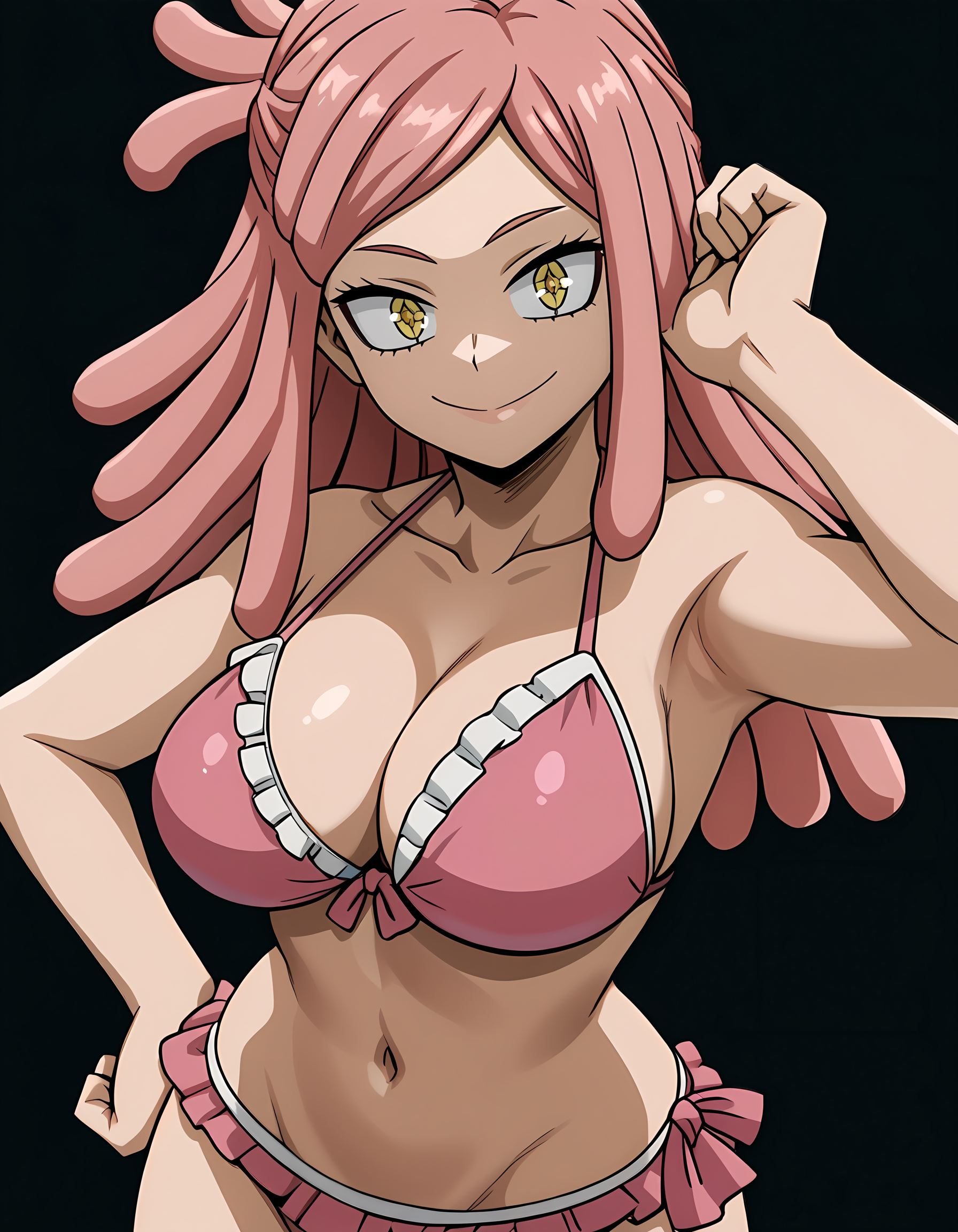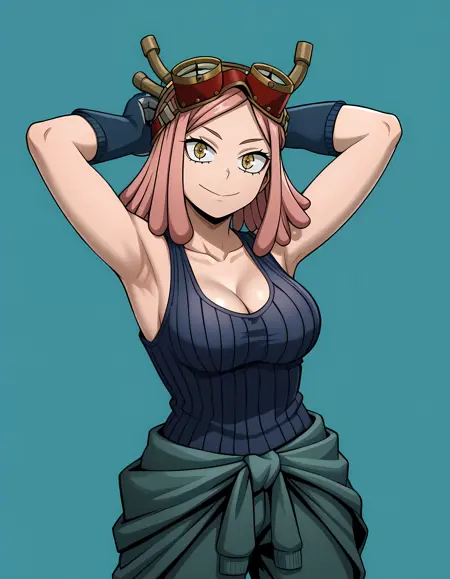 워크숍 복장: 머리에 안경, 검은 탱크탑, 소매 없음, 허리 주변에 옷, 미니 스커트