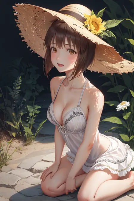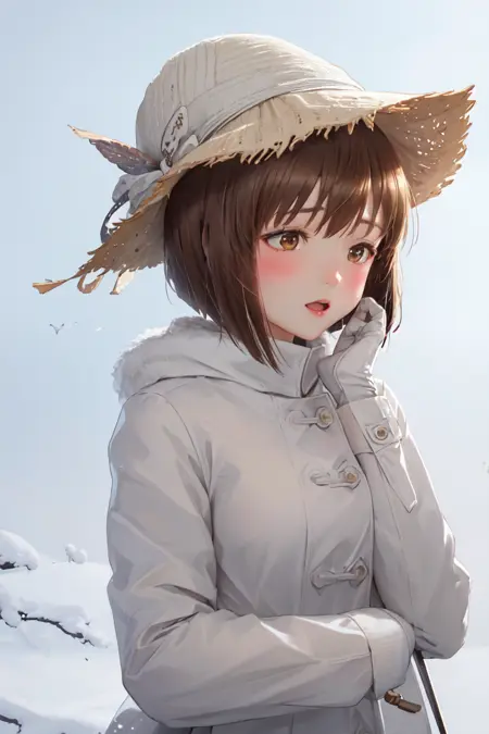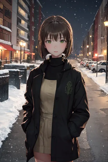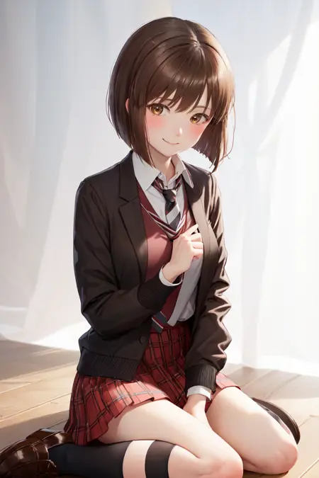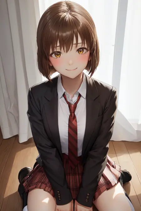 For better face add "short hair, brown hair, bangs, bob cut,"