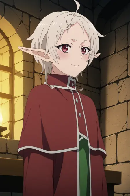 Triggers : sylphiette greyrat,1girl,solo,looking_at_viewer,pointy ears,short hair,elf,sunglasses,long sleeves,smile,gloves,capelet