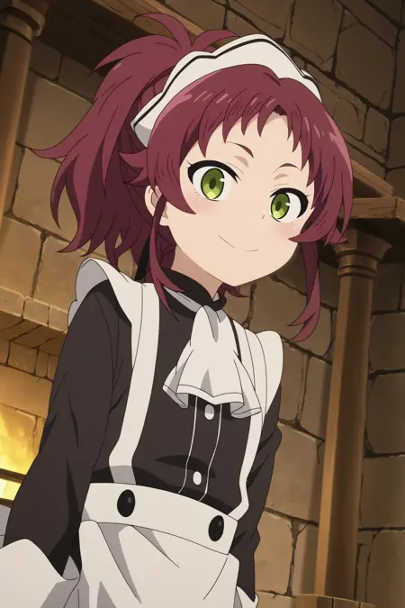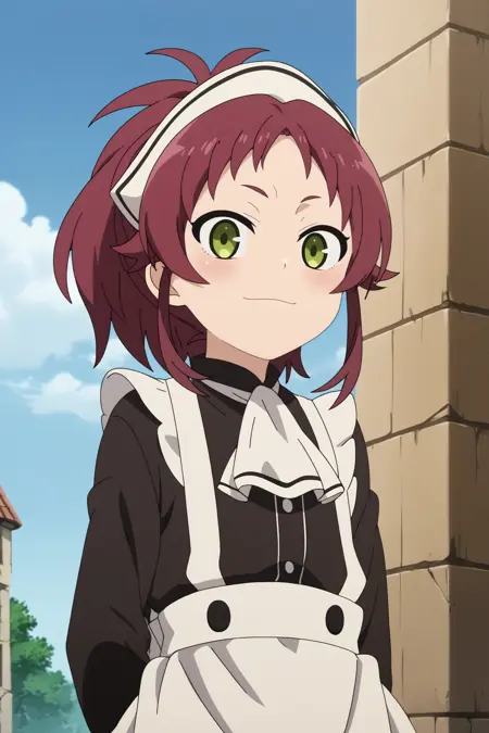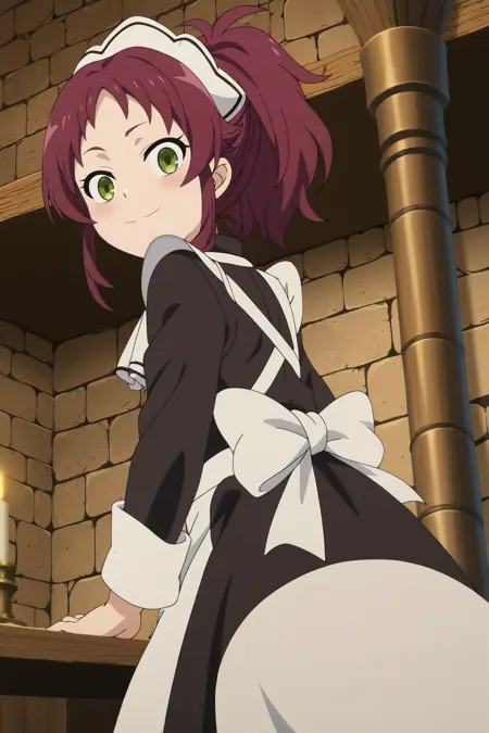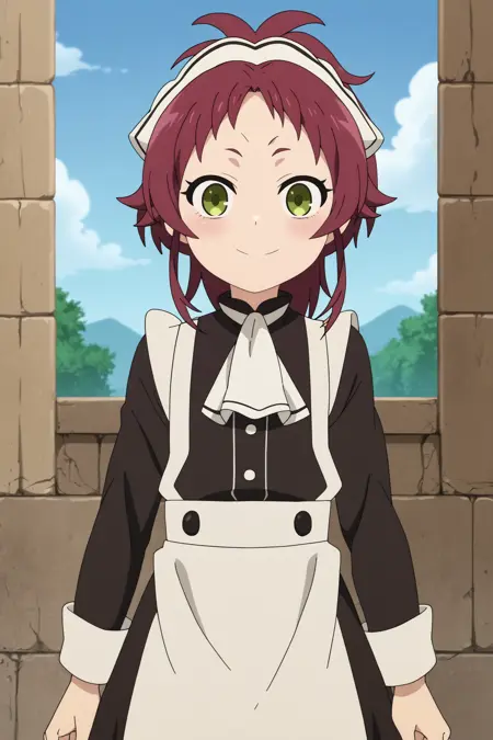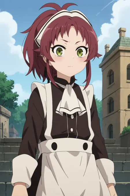 触发词:aisha greyrat,1girl,solo,looking_at_viewer,apron,maid,long sleeves,ascot,ponytail,maid headdress