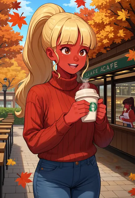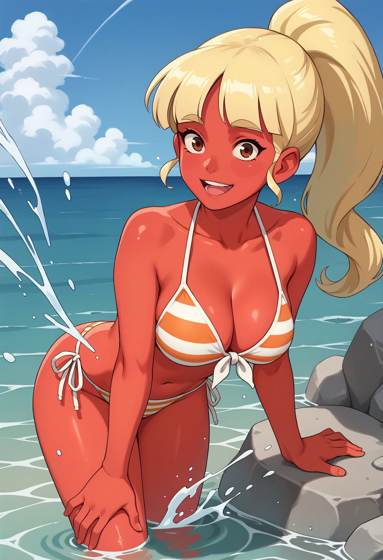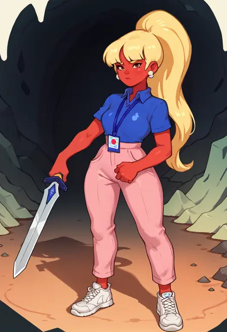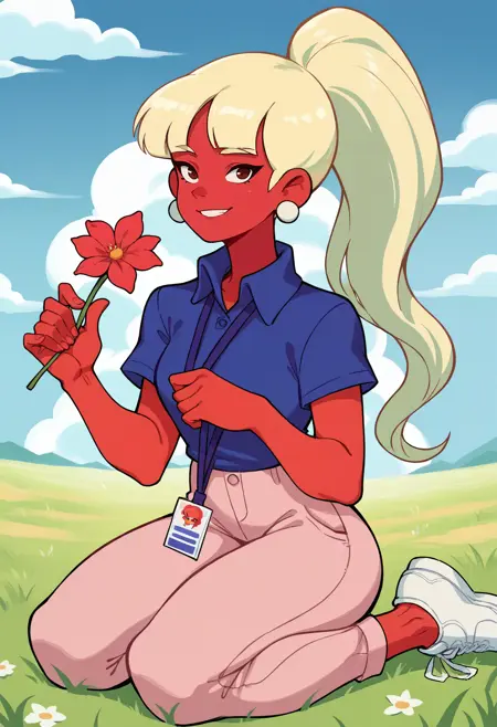 Default appearance: jackie, blonde hair, high ponytail, long hair, blunt bangs, red skin, brown eyes, white earrings, blue shirt, collared shirt, medium breasts, short sleeves, lanyard, pink pants, high-waist pants