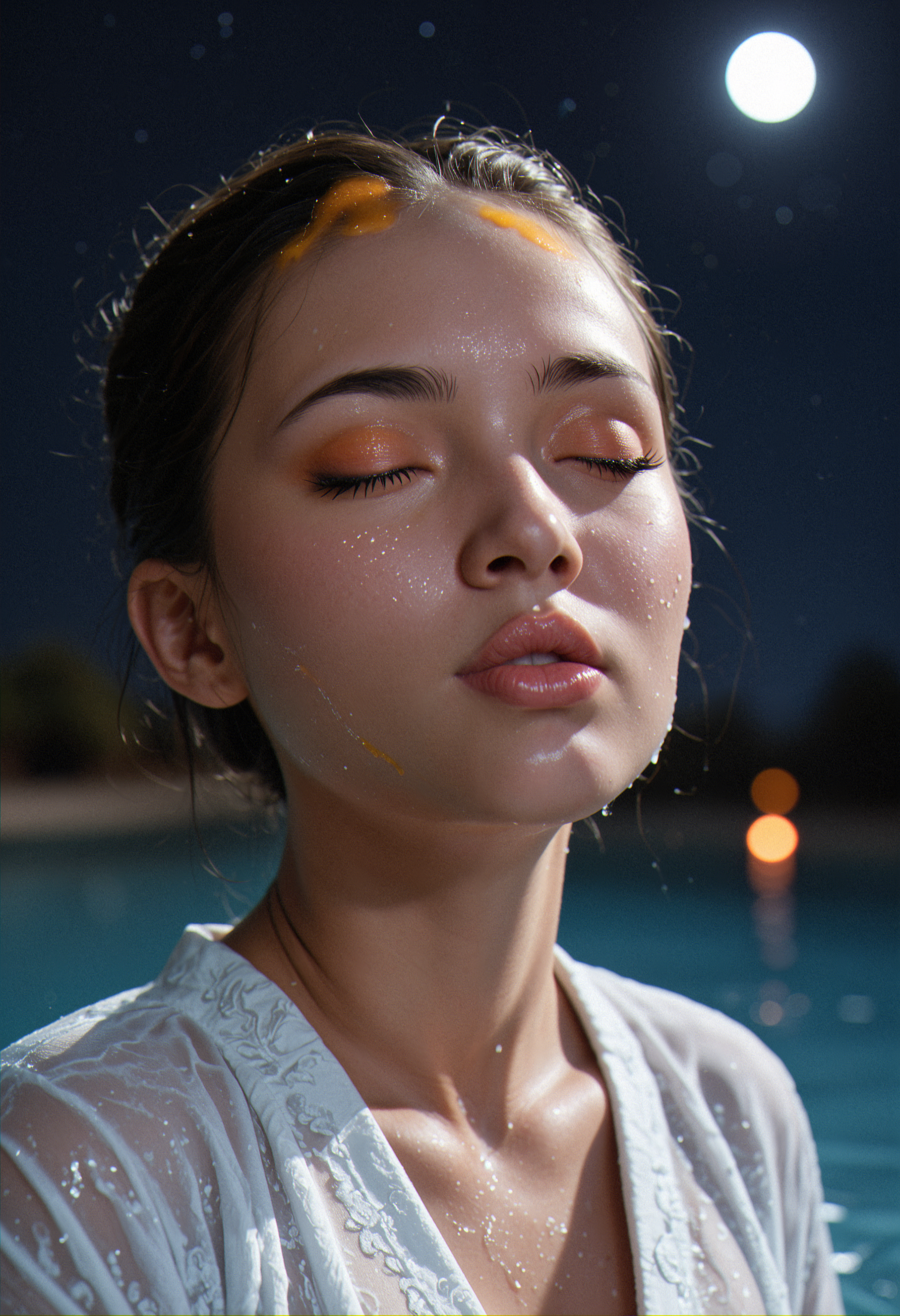 使用另一组在体型、女性和低光环境下训练的 LoRAs 进行新混合。初始生成效果并不出色,但通过使用反采样技巧、再进行一次超分辨率采样,最后使用 FaceDetailer 处理后,结果非常惊人。在我的 RTX 3090 上,每张图像耗时 72 秒。