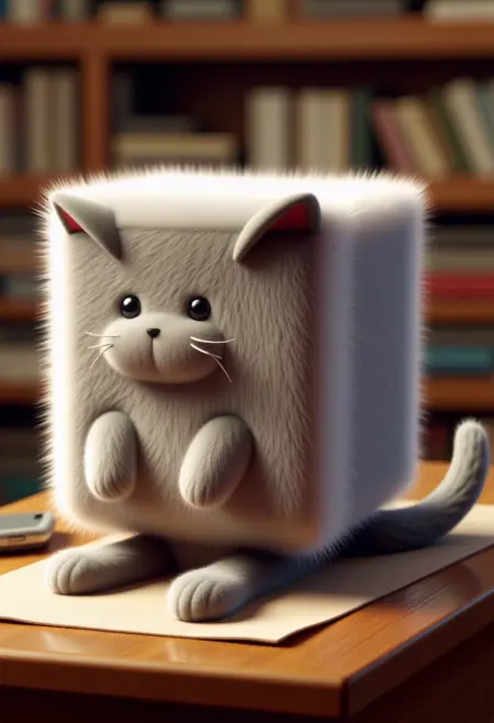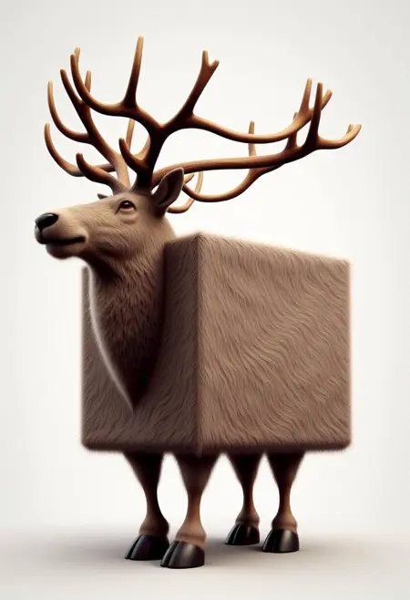 - この画像は、スタイル化された人間化された(CREATURE)を描いた、非常に詳細なデジタルアートです。(CREATURE)は、生地や布地のように見える厚い(FUR/FEATHERS/SCALES)で覆われた、独自のキューブ形状の体を持っています。(追加の場所/行動の詳細)