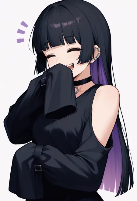 Trigger + Appearance: p4s4n, ear piercing, lip piercing, colored inner hair, black hair, purple hair, hime cut, green eyes
