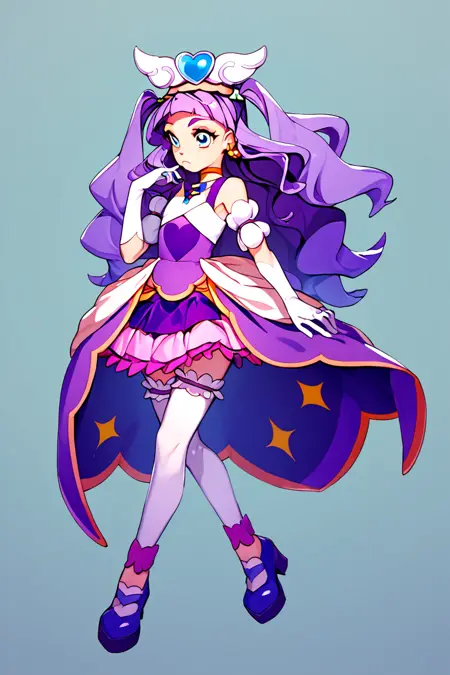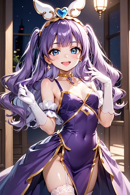 curemajesty, 1girl, solo, purple hair, purple dress, gloves, long hair, dress, thighhighs, magical girl, white gloves, blue eyes, elbow gloves, jewelry, earrings, white thighhighs, purple footwear, choker,