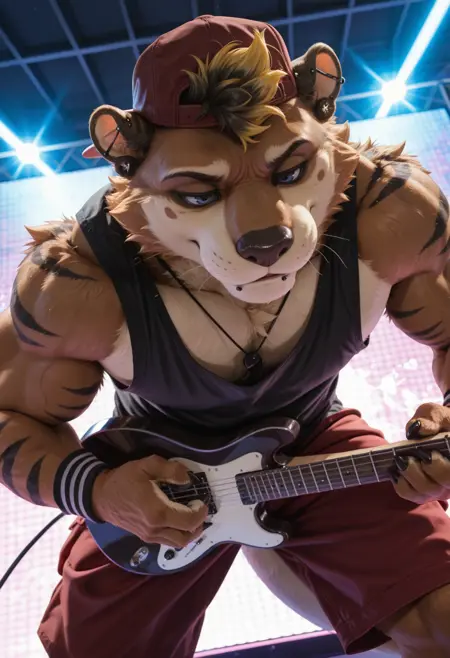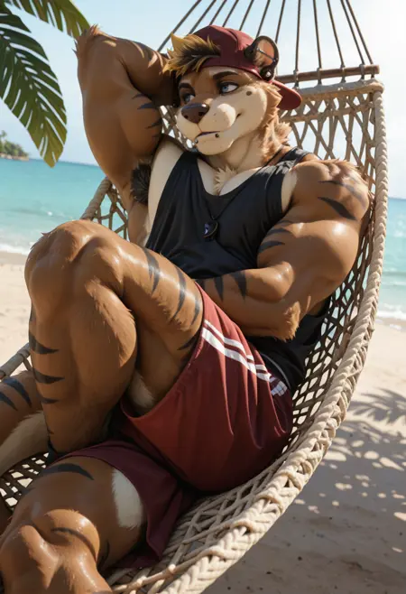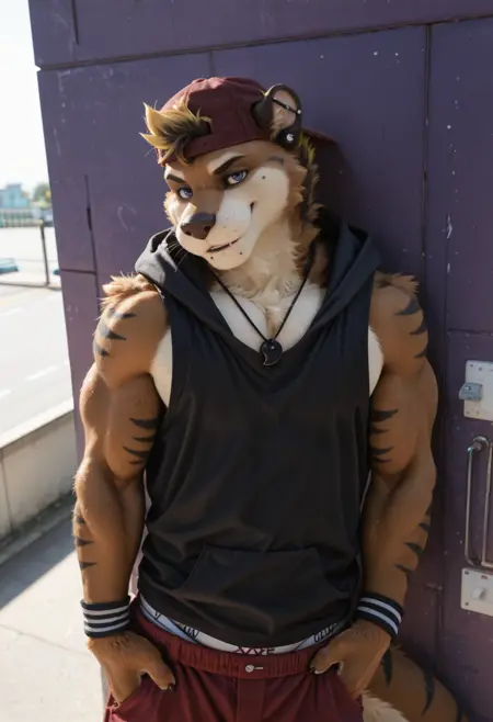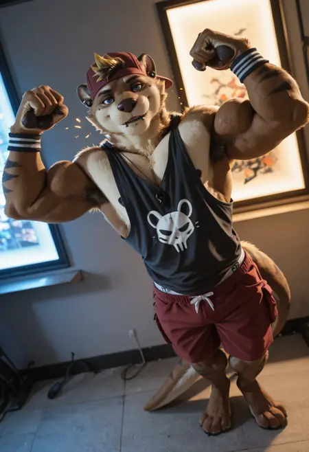 // Illustrious: kyo_kiasano, otter boy, furry male, bara, muscular, 1boy, solo, piercing, fur, hi res, looking at viewer, blue eyes, ear piercing, black pendant necklace, clothed, clothing, baseball cap, male underwear, black tank top, red shorts, wristbands