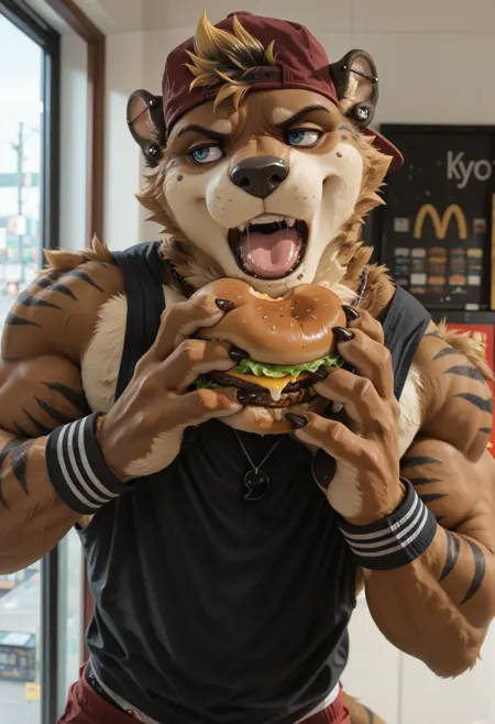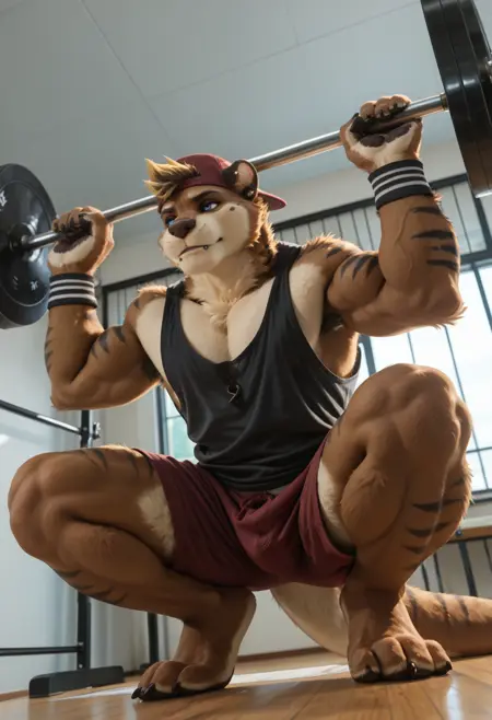 // Pony: kyo_kiasano, anthro, male, 1boy, male focus, solo, furry male, furry, muscular, bara, piercing, animal ears, blue eyes, stripes, teeth, tail, sweat, necklace, red shorts, black tank top, navel, short hair, small ears