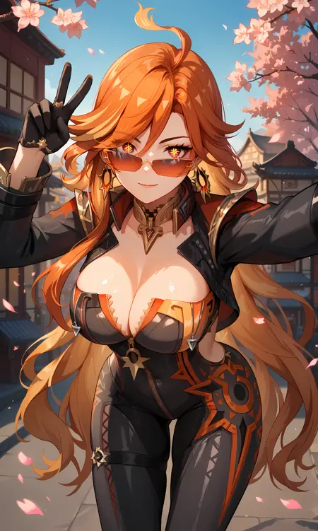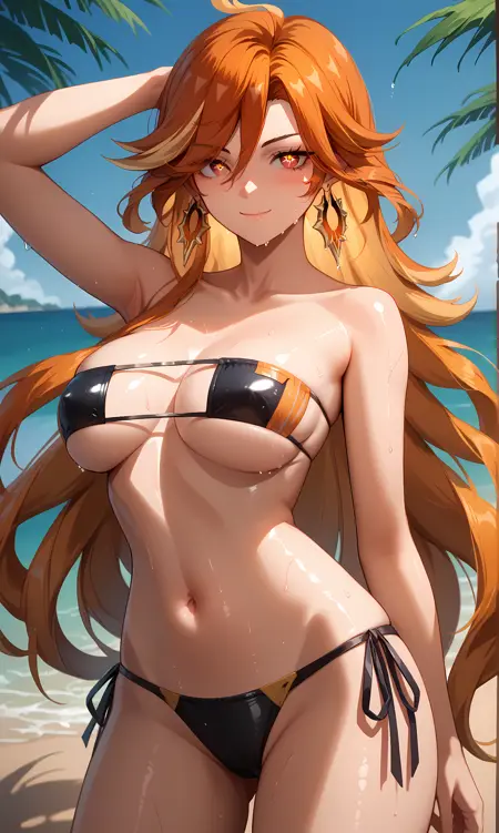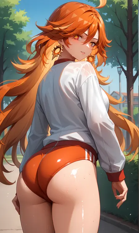 mavuika_genshin, 주황색 눈, 태양 모양의 동공, 주황색 머리, 긴 머리, 스트라이프 머리, ahoge