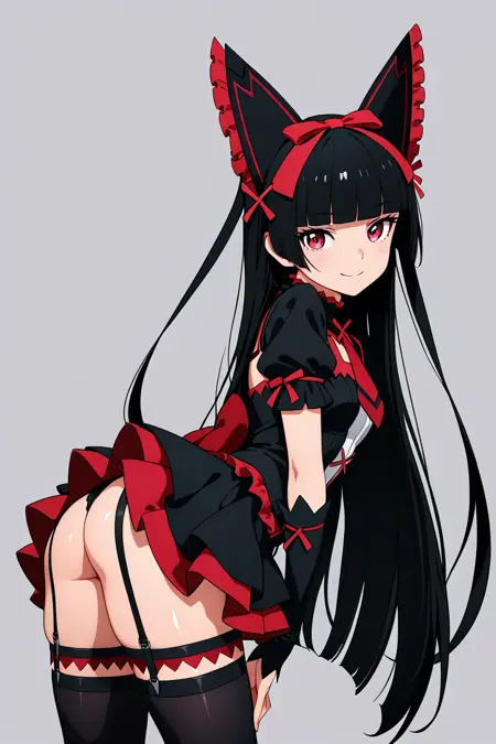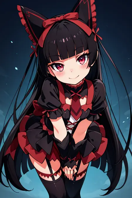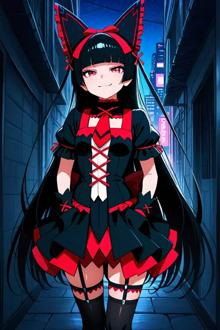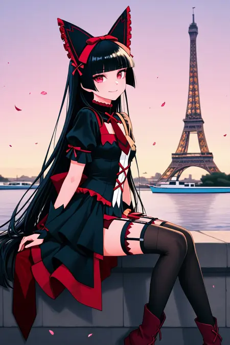zzRory,红眼睛,长发,黑发,齐刘海,姬发式,非常长的头发,发带,黑色连衣裙,黑色过膝袜,吊袜带,蝴蝶结,