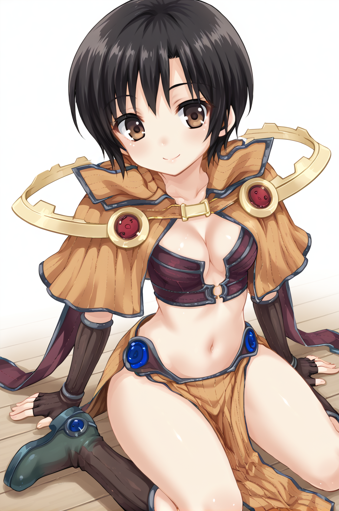 提示词: sageRO,靴子,肚脐,腹部,骨盆帘,乳沟,丁字裤,肩甲,棕色露指手套,棕色肘部手套,短披风,竖条纹,腰部披风