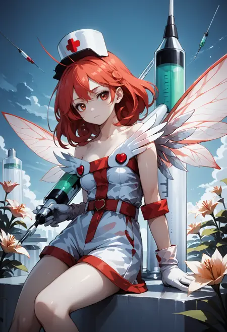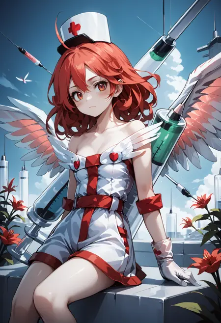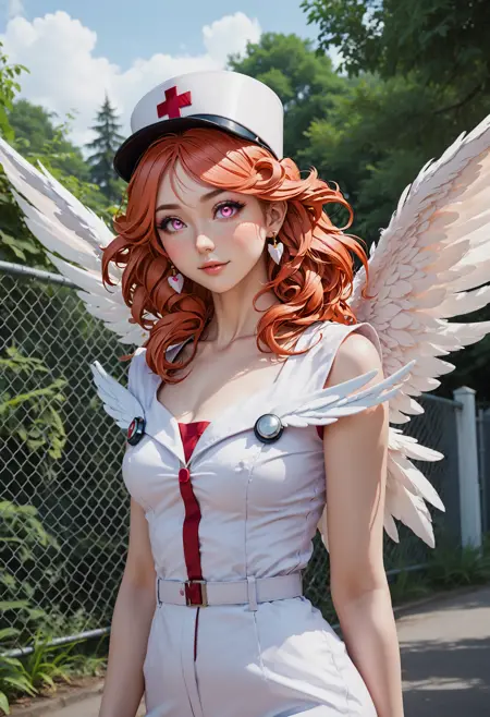 その他の推奨プロンプト: ピンク/レッドの髪、ピンク/レッドの目、看護師の服、白い靴、天使の翼、羽の翼、レッドとホワイトの衣装