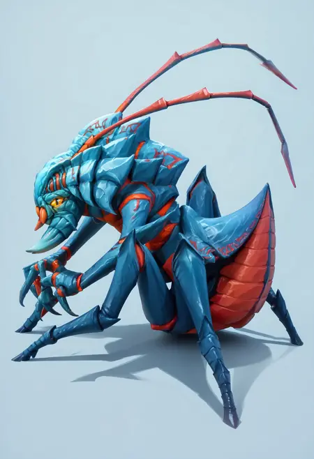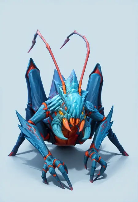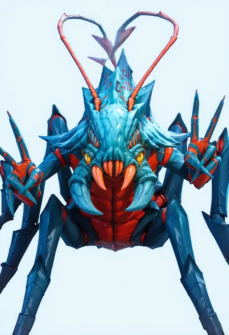 no humans, monster, antennae, claws, teeth, yellow eyes, yellow sclera, arthropod limbs