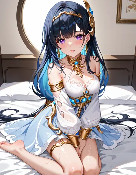 AriaOfNymph, very long hair, low tied long hair AoN_dress, AoN_detached sleeves, AoN_hair_ornament, AoN_thighlet, AoN_earrings,AoN_sandals